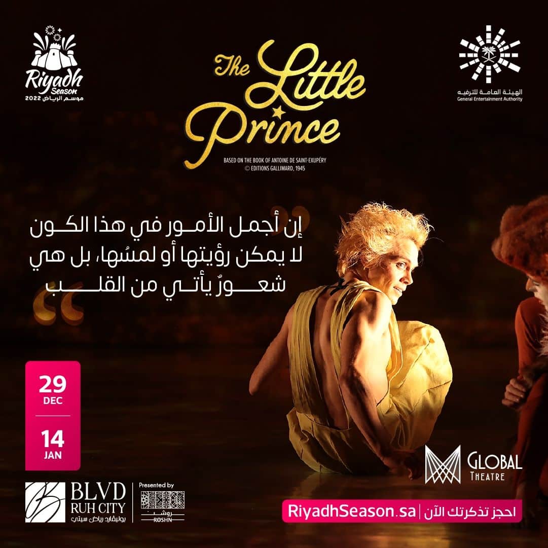 ضمن فعاليات موسم الرياض 2022، ينطلق يوم الخميس 29 ديسمبر، بمنطقة "بوليفارد رياض سيتي"، عرض عالمي مقتبس من مسرحية "الأمير الصغير"، لينقل المشاهدين من الواقع إلى عالم الفانتازيا، برؤية إبداعية مختلفة.