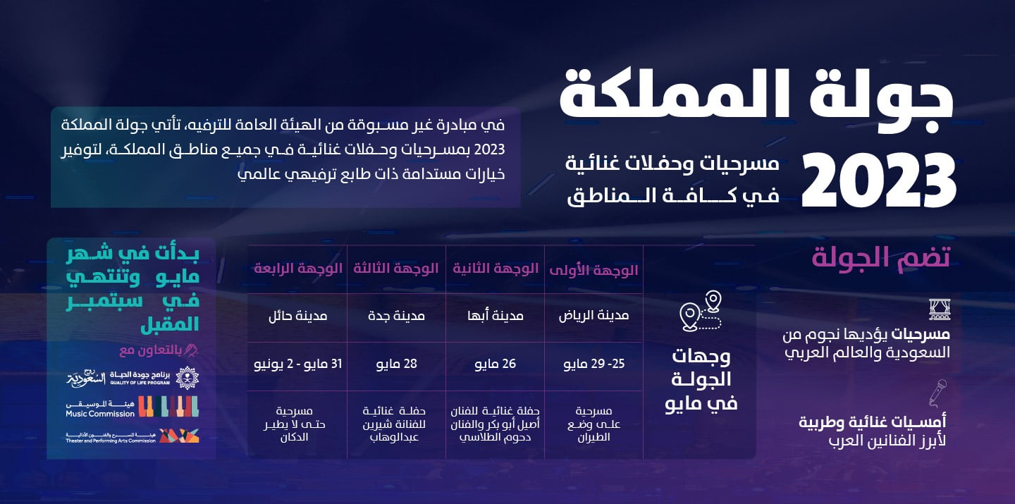 The highly anticipated tour includes a variety of concerts and plays featuring Saudi and Arab stars, as well as young talents from the Kingdom. The tour's events will take place in all regions of Saudi Arabia, organized by the General Entertainment Authority in collaboration with the Music Commission, the Theater and Performing Arts Commission, Visit Saudi, and the Quality-of-Life Program.