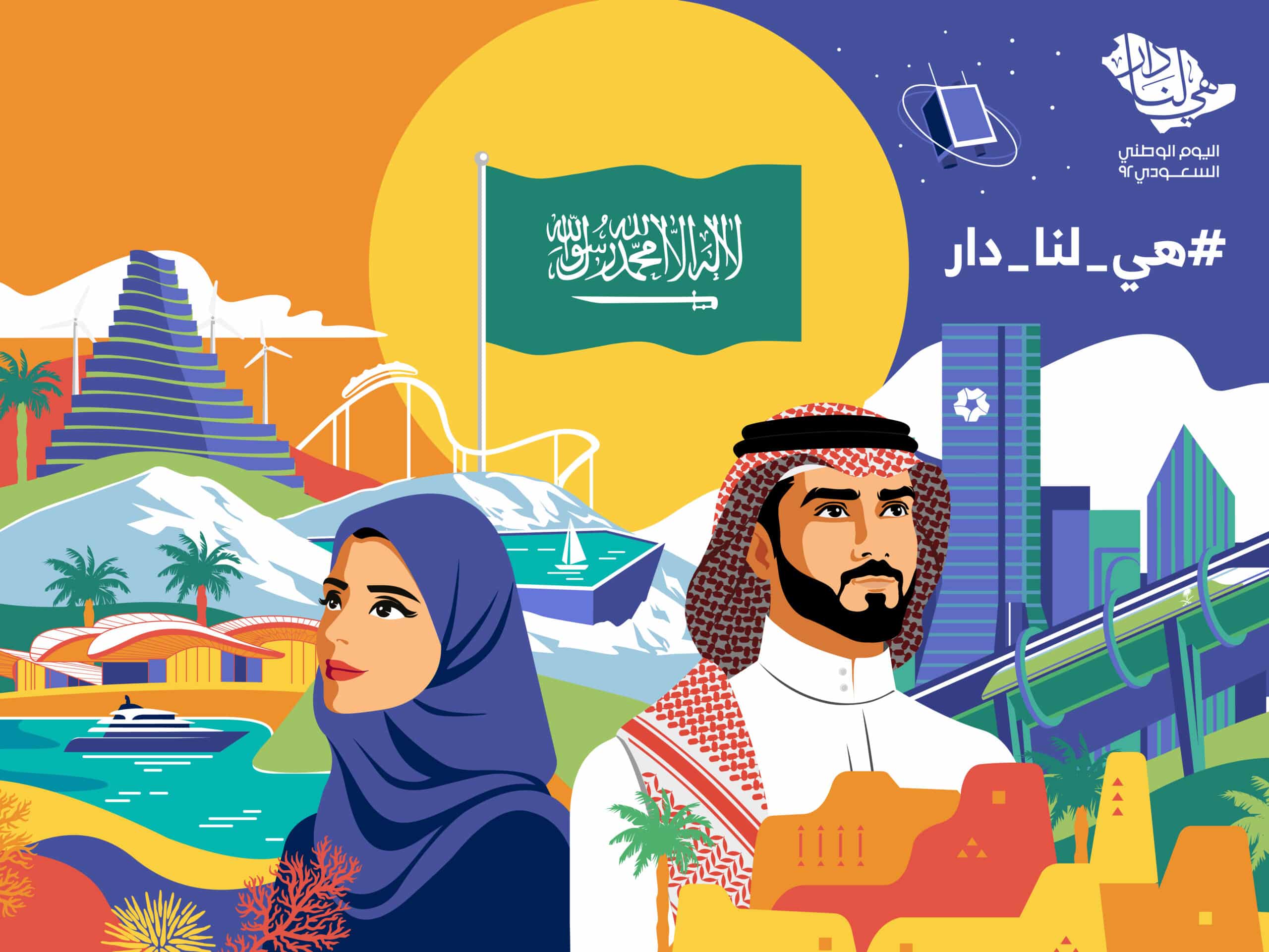 On this firm basis, the identity of the 92nd Saudi National Day this year, which is designed by the General Entertainment Authority, comes in the form of two combined slogans, one verbal and the other artistic, inspired by the ambitions and aspirations of the Saudis and their pride in belonging to this ancient nation. The identity takes its verbal slogan from the phrase: “It is our home” because of its sincere and deep connotations, as well as touching the conscience of the Saudis who used to describe their homeland as the home in many popular songs and poems that represent part of their heritage and present.