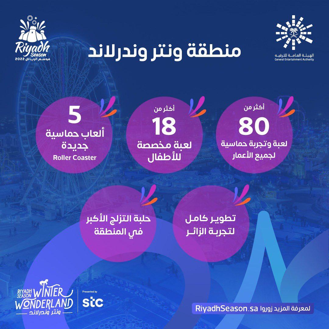 The zones of Riyadh Season 2022 are Boulevard World, Boulevard Riyadh City, Winter Wonderland, Al Murabaa, Sky Riyadh, Via Riyadh, Riyadh Zoo, Little Riyadh, The Groves, Imagination Park, Al-Suwaidi Park, Souq Al Zel, Qariat Zaman, Fan Festival and Riyadh Front.