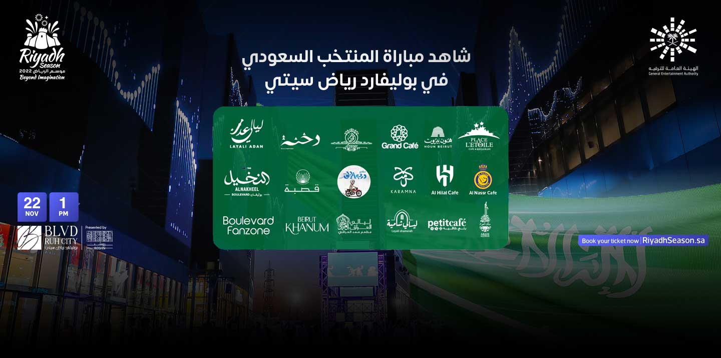 Boulevard Riyadh City will receive visitors to support the Saudi national team and allow them to watch the match in many restaurants amid charming views, enthusiastic vibes, fun and excitement while following the most important football event in the world.