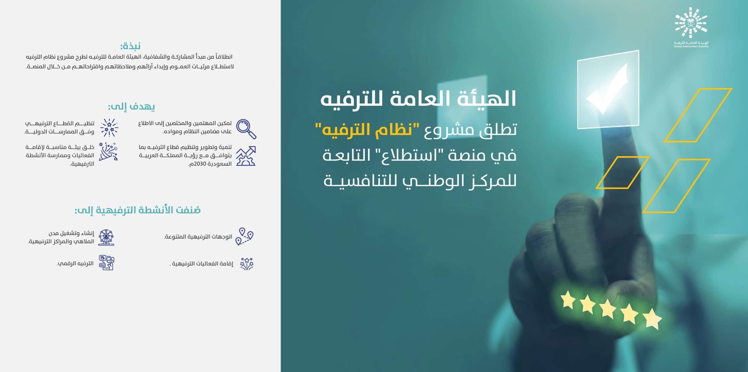 أعلنت الهيئة العامة للترفيه عن طرحها لمشروع نظام الترفيه لاستطلاع مرئيات العموم في منصة "استطلاع" التابعة للمركز الوطني للتنافسية، وذلك انطلاقاً من مبدأ المشاركة والشفافية، وبهدف تمكين العموم والمهتمين والمختصين في القطاعين العام والخاص من الاطلاع على مضامين النظام ومواده، وإبداء آرائهم وملاحظاتهم واقتراحاتهم من خلال المنصة.