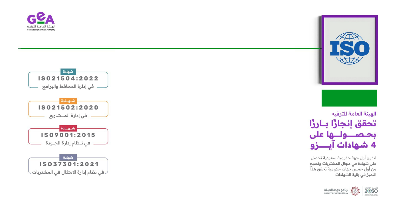 استمراراً للتميز والكفاءة، والتزام الهيئة العامة للترفيه (GEA) بتطبيق أعلى المعايير العالمية في أعمالها، حصلت الهيئة على مجموعة من شهادات الاعتماد الدولية في مجالات الجودة والامتثال، ما يعزز مكانتها كجهة رائدة في القطاع الحكومي. حيث حصدت الهيئة أربع شهادات اعتماد من المنظمة العالمية للمقاييس (ISO)، من بينها شهادة تُعد الأولى من نوعها التي تحصل عليها جهة حكومية في قطاع المشتريات بالمملكة، فيما نالت الشهادات الثلاث الأخرى ضمن أولى خمس جهات حكومية. وتضمنت هذه الشهادات: ISO 9001:2015 الخاصة بنظام إدارة الجودة، وISO 21502:2020 لنظام إدارة المشاريع، وISO 21504:2022 لنظام إدارة المحافظ والبرامج. أما شهادة ISO 37301:2021 الخاصة بنظام إدارة الامتثال، والصادرة عن شركة TÜV AUSTRIA العالمية، فكانت قد حصلت عليها الهيئة ممثلة في الإدارة العامة للمشتريات. ويعد هذا التميز، تأكيداً على التزام الهيئة بتطوير الأداء المؤسسي وتعزيز الامتثال وفق أفضل الممارسات الدولية. ويأتي هذا الإنجاز استكمالاً لمسيرة الهيئة، حيث سبق لها في مطلع هذا العام أن حصلت على شهادتي ISO 31000:2018 لنظام إدارة المخاطر، وISO 31022:2018 لنظام إدارة المخاطر القانونية. وتأتي هذه الإنجازات بعد جهود كبيرة بذلتها الهيئة لتعزيز الامتثال للأنظمة والقوانين، بما في ذلك الملكية الفكرية، وتطبيق أفضل الممارسات في جميع فعالياتها وبرامجها.