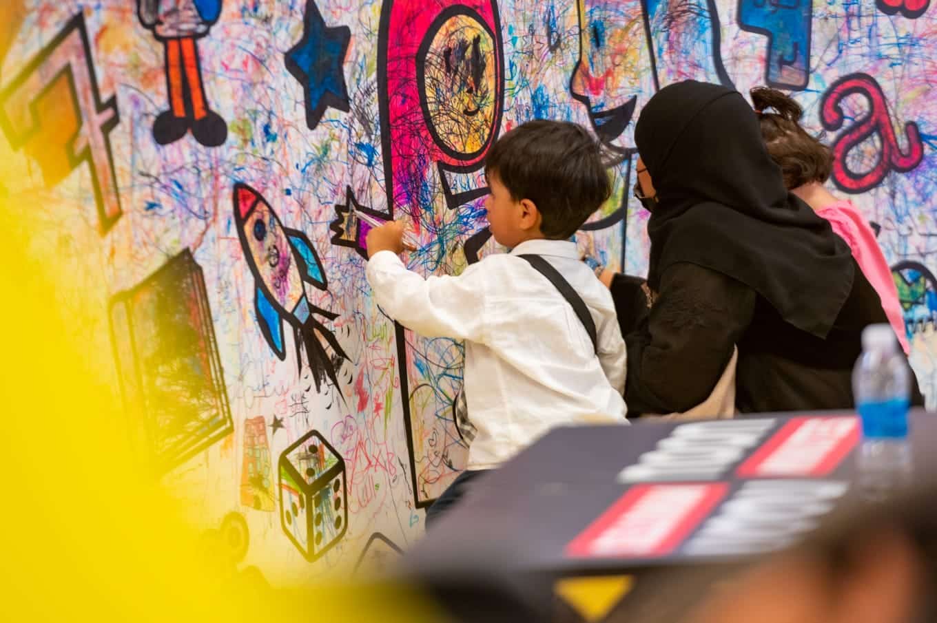 وتنتشر بأروقة المهرجان تصاميم ورسومات مدرسية متنوعة كأقلام الرصاص والألوان، وعدد من العناصر التي تشكل جزءًا من ذاكرة الدراسة لدى الطلاب والطالبات.